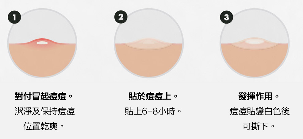 | 溫和吸收痘痘分泌物 | 保護肌膚免受擠壓 | 適用於敏感肌膚 |